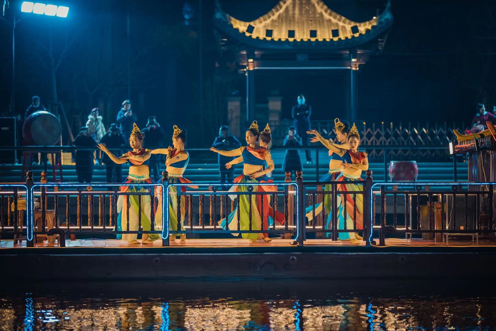 簡介:串場河是鹽城一條歷史悠久的大河,已有1200多年的歷史,孕育了深厚的鹽文化,豐厚了沿線各地人文史話。一場以串場河之旅開啟的行進式實景演出《串場夜畫》,包含了淮劇《范公堤》經典唱段、情景表演《祭?!贰⒐诺湮璧浮端钟∠蟆?、輕樂隊表演《我把鹽城唱給你聽》、情景舞蹈《鶴鹿同春》、雙船表演《流動之境》等共10個演藝項目,充分展示串場河的景色之美、人文之美、風物之美。游客不論是乘坐游船還是漫步兩岸,都能在欣賞沿途風光的同時領略串場文化,感受鹽城夢幻之夜。